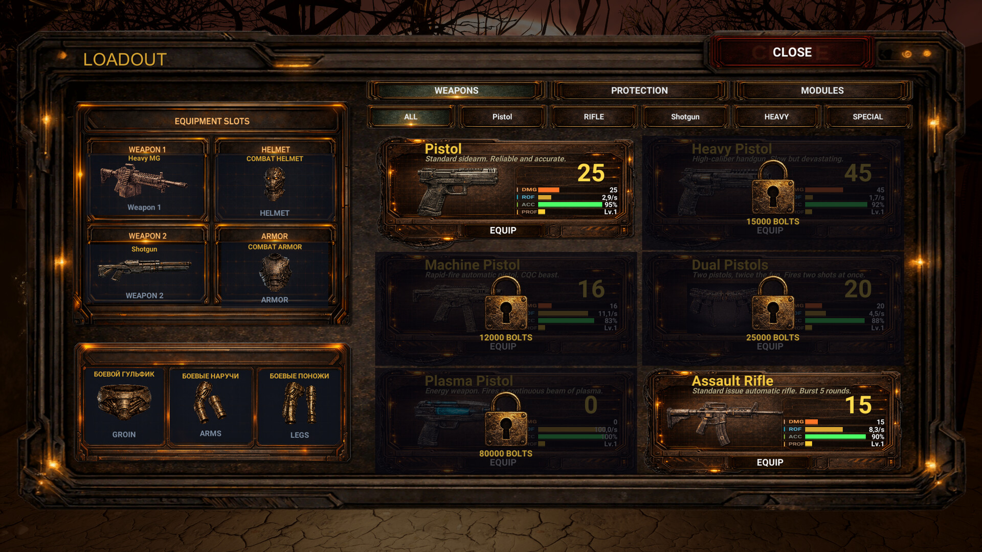 ✅ 25 weapons, 30+ implants, 5 armor types, body part system