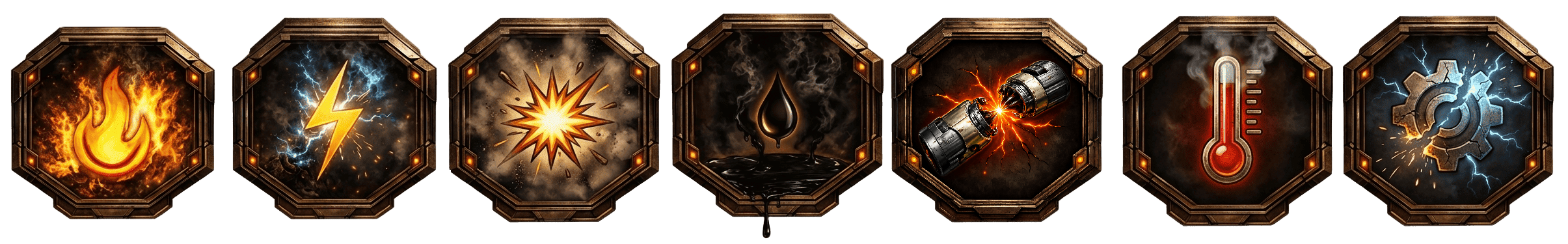 • Status Effects — Burning, stun, contusion, system malfunction, oil leak, overheating. Stack them for devastating combos